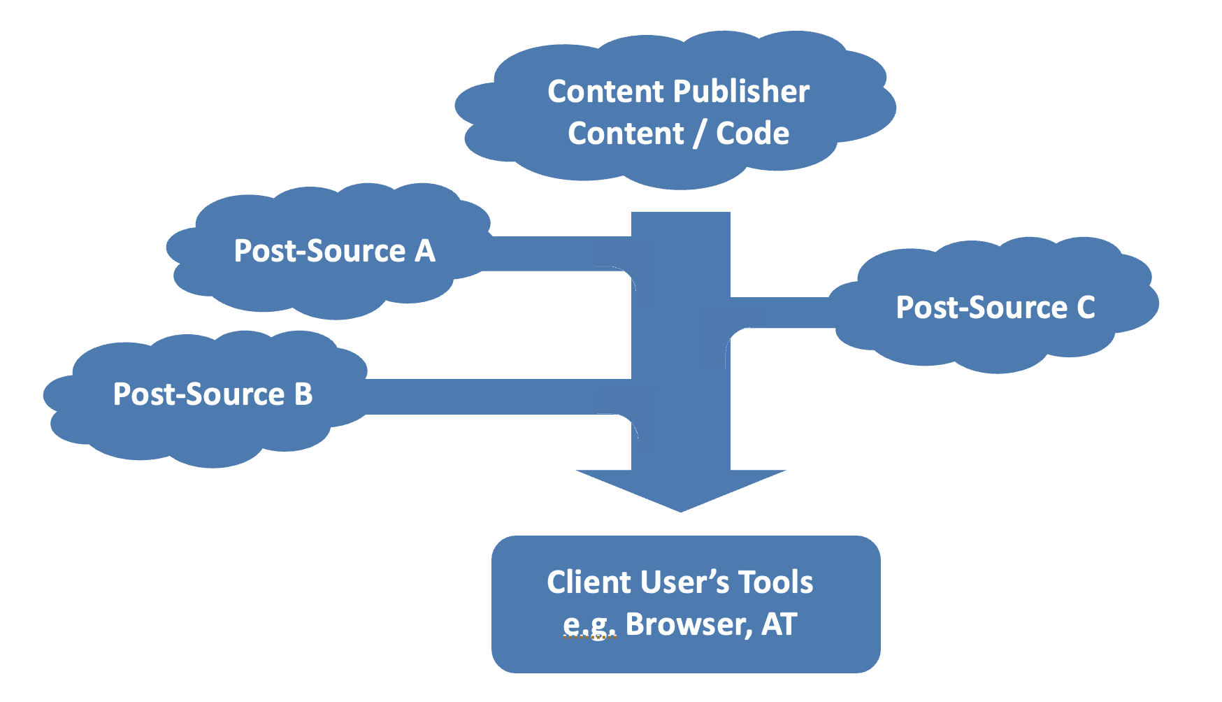 Dear Community Group, We revised the diagram based on today’s discussion. The diagram is attached here and described below. [cid:image001.png@01DB72A0.55588500] The diagram represents a model where post-source adaptations enhance accessibility beyond the original content provided by the publisher. Here’s a breakdown of its structure: 1. Content Publisher (Content/Code) – At the top is the starting point, where the original web content or code is created by the publisher. The publisher has the sole authority to configure, or allow, any post-source adaptations to be called into play. 2. Post-Source A, B, C – These represent various post-source accessibility modifications or enhancements that occur after the content is published. Examples include (a) Automated or third-party-generated captions for videos (b) image alternative texts (c) personalization widgets and many other adaptations described in the document. 3. Client User’s Tools (e.g., Browser, AT) – This is the endpoint where the content is consumed by the user. The client cannot easily distinguish the provenance of all the content and adaptations, which are processed equally for rendering by the end-user’s user agent and its ecosystem. Assistive technologies (AT), such as screen readers, browsers, or other user-side tools, integrate the post-source modifications for improved accessibility, and are consumed on the end user’s devices. The diagram visually conveys the concept that accessibility is not solely dependent on the content publisher but can be enhanced through external post-source mechanisms before reaching the user. Let me know if you need a refined version or additional context! The minutes can be found here, https://www.w3.org/2025/01/29-a11yedge-minutes.html -- Lionel Wolberger CCOO UserWay, A Level Access Company