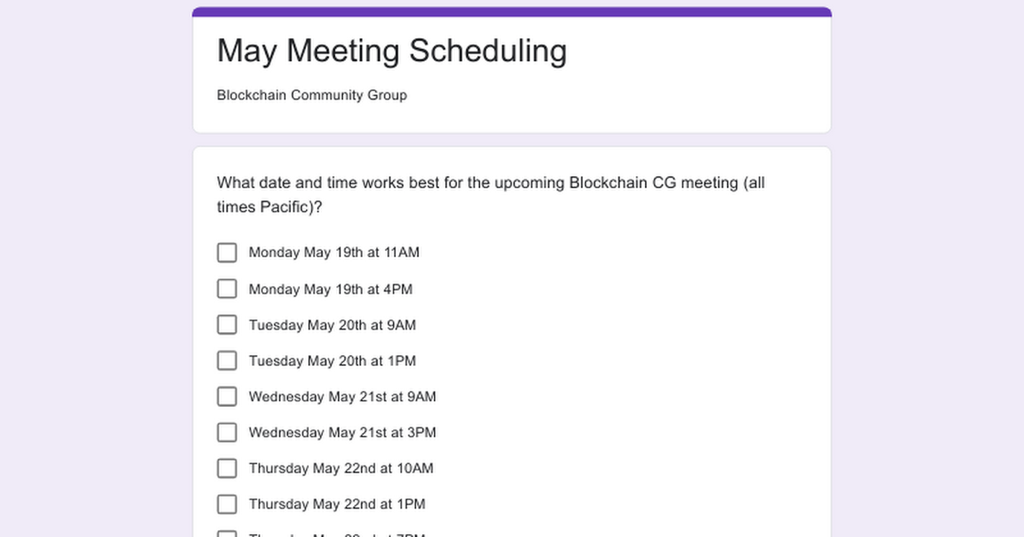 In preparation for the next meeting, here’s a poll where you can vote for a time you’re free the third week in May! https://forms.gle/cNgEwmADb9jT3g5D6 May Meeting Scheduling forms.gle Here’s a link to our preliminary agenda for the next meeting. All these are still subject to change and confirmation by the relevant participants. If you have any updates, suggested edits, or additional topics we should cover — please share them with the group and I will happily add them. https://docs.google.com/document/d/1Kcr4CqCsQd4fImUSYTeWQAPFoN9wm2Rvmelibim0PKE/edit?usp=sharing Blockchain Community Group — Preliminary Agenda — May docs.google.com Thanks for your contributions to this group, and for helping start the process to make blockchain standardization a reality on the Web Platform.