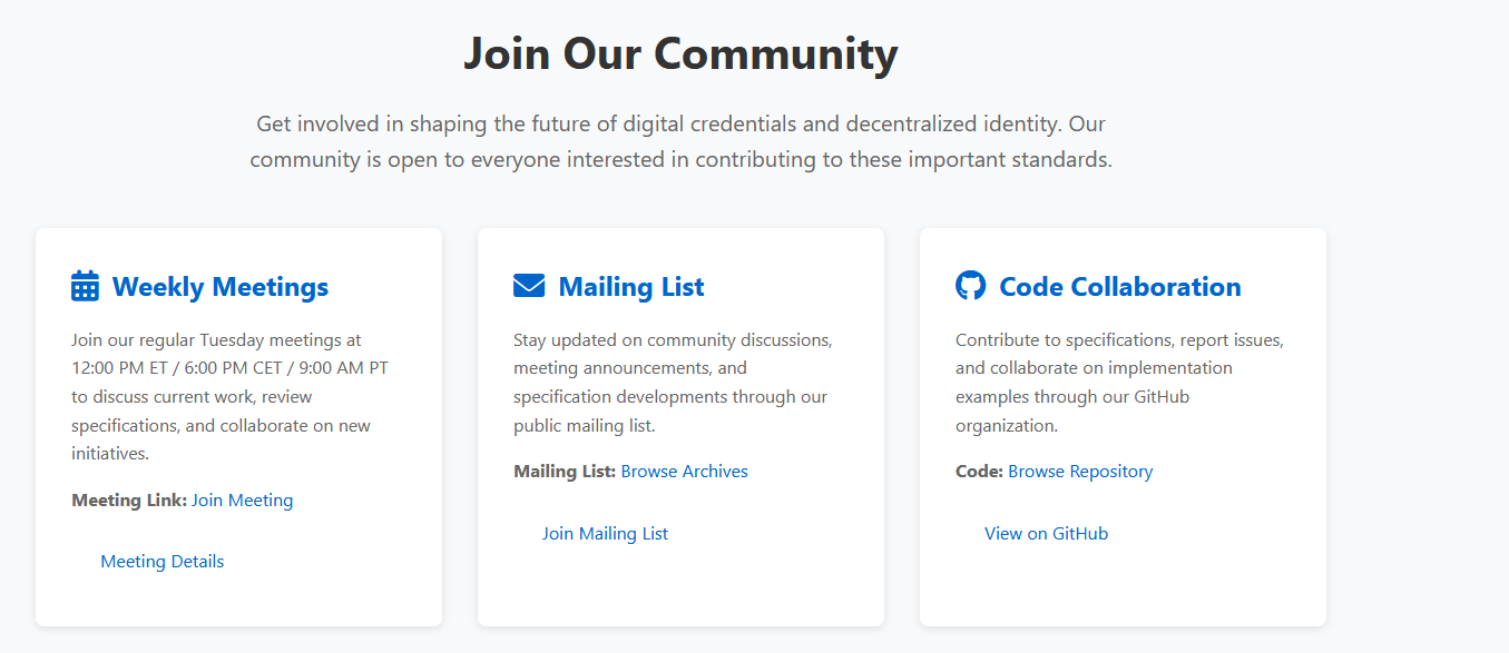 Thank you so much! It looks much better. Responses inline. ________________________________ From: Manu Sporny <msporny@digitalbazaar.com> Sent: Friday, July 11, 2025 5:57 PM To: Mahmoud Alkhraishi <mahmoud@mavennet.com> Cc: W3C Credentials CG <public-credentials@w3.org> Subject: Re: Time for an updated CCG website? On Mon, Jul 7, 2025 at 1:44 PM Mahmoud Alkhraishi <mahmoud@mavennet.com> wrote: > I would like a call-out that mentions who the current chairs are and a link to reach out to them. Done, via "Join Our Community" section. I don't see any changes here: [cid:584b4405-f706-4627-ad28-ef0eedec6860] > List of current incubation groups/meetings. Done, via "Join Our Meetings" button at top of landing page. Really, it's just a list of all upcoming meetings held by the group, which people can browse through. Lgtm > In the list of current specs, which group/meeting is it discussed in Will and I were discussing this in an issue: https://github.com/w3c-ccg/community/issues/251#issuecomment-3045934600 ... and thought that adding a link to the top of each spec, which links to the meeting calendar for where the work is happening might be useful. See the VC API spec for an example (search for "Meetings": https://w3c-ccg.github.io/vc-api/ Does something like that work for you, Mahmoud? This works great. > List of final reports ( maybe another subheading under specs? So it would be Standards, Incubation, Final Reports) Done. lgtm > Ideally, the list of specs/reports would just be a markdown/yaml table the chairs can just edit rather than HTML. I just linked to the community page that lists all final reports. lgtm > A policies section, the old website had these: and I believe it would be helpful to maintain, I only found links to the Code of Ethics and the CLA I tried refactoring the bottom of each page to include links to each of those items you listed. Let me know if that addresses your concerns, Mahmoud... noting that we can always iterate later once the site is in place. lgtm -- manu -- Manu Sporny - https://www.linkedin.com/in/manusporny/ Founder/CEO - Digital Bazaar, Inc. https://www.digitalbazaar.com/