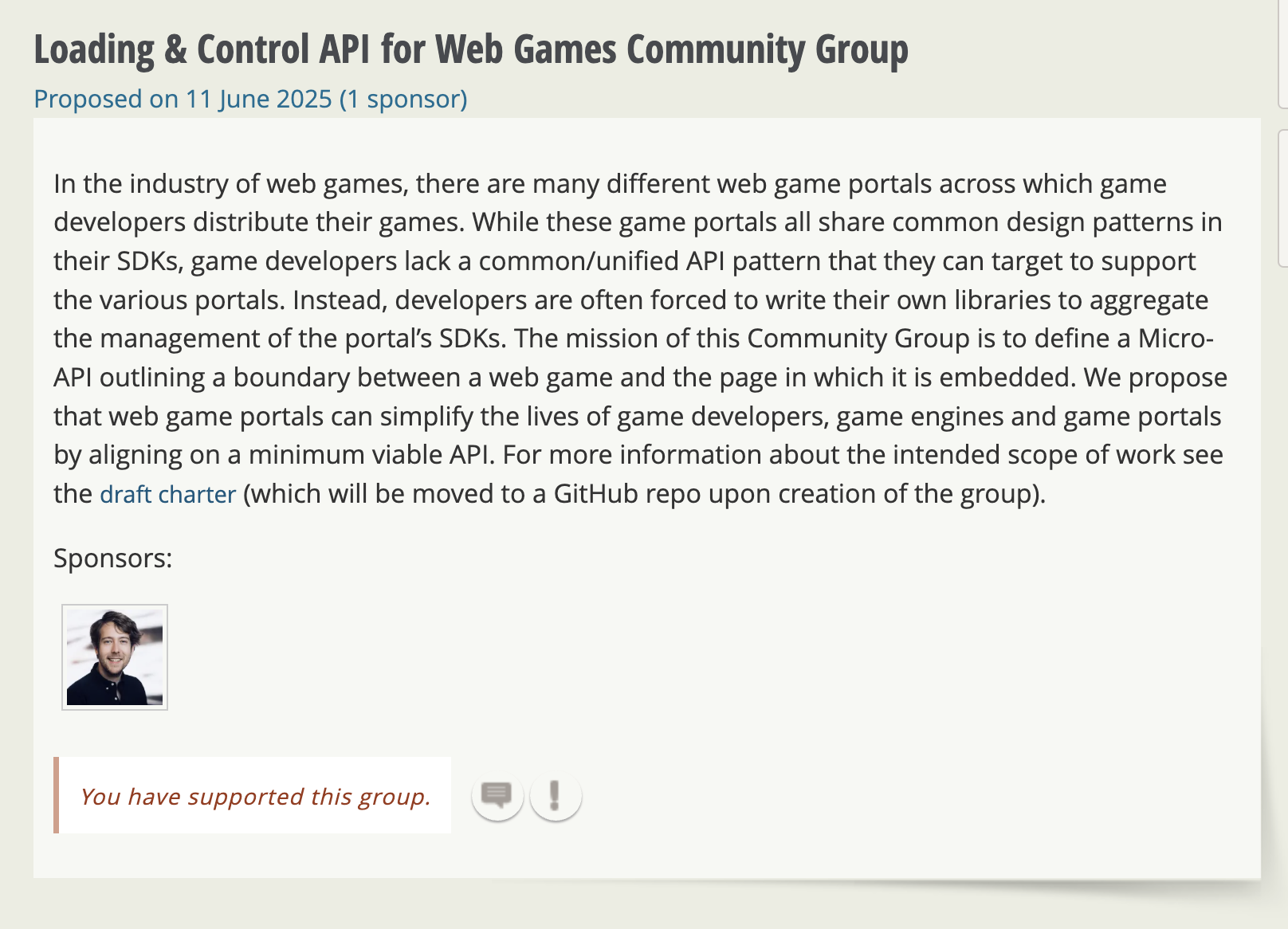 Following up on that last email. The new group has now reached enough sponsors and so therefore has launched. Thank you all! https://www.w3.org/community/loading-control-games/ If you are interested in participating in the discussion please join the new group. We intend to hold our first meeting as part of the new group soon, once the date is decided I will cross-promote the first meeting via this group's mailing list. Cheers Tom On Tue, Jun 17, 2025 at 10:13 AM Tom Greenaway <tomgreenaway@google.com> wrote: > Hi all, > > As discussed previously, we finalised the charter for the new Loading and > Control API for web games community group. As a result, we have > proposed the new group on the W3 website here: > > > https://www.w3.org/community/blog/2025/06/13/proposed-group-loading-control-api-for-web-games-community-group/ > > In order for the group to be fully created it requires at least 5 sponsors > (people to support the group). If you are interested in seeing the group > created and/or wish to participate in its activities, please take a moment > to log in with your W3 account and sponsor the creation proposal here: > > https://www.w3.org/community/groups/proposed/#loading-control-games > > You'll need to scroll down the page to see it, it will look like this: > [image: image.png] > > Thank you to everyone who helped with the charter and looking forward to > continuing the discussion in the new group. > > Cheers > > Tom Greenaway | Developer Solutions | Developer Experience | Google > France >