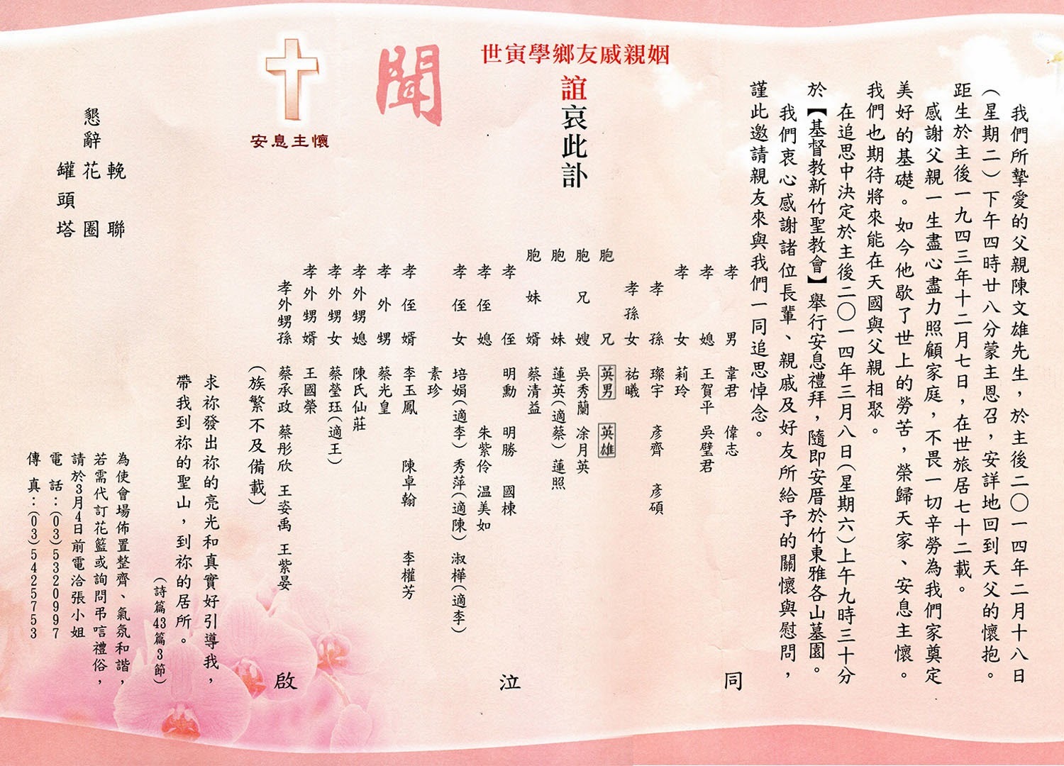 > > The symbol of death is used outside the character frame of a person's name > > Could we have an example? Even an example in the text would be useful, if we can't scan one. I think it would be particularly useful to show it in the context of the character frame of the name. Here's some examples I found by Google image search. I'm afraid that they seem to be real funeral announcement. 1. [Taiwan, 2014](http://2.bp.blogspot.com/-bvzkEhW3TNE/UxQ4hJw000I/AAAAAAAAGK8/oGlB8QB2fYU/s1600/陳文雄訃聞.jpg) 2. [Taiwan, 2017](http://www.chi-nanchurch.tw/bulletin/communion/copy3_of_.jpg/@@images/7c0ed0f8-e548-4110-83f1-01e7c1c89b91.jpeg) 3. [HongKong, 2017](https://www.mingpaocanada.com/tor/ftp/News/20170228/HK/_28ME009_.jpg) -- GitHub Notification of comment by bobbytung Please view or discuss this issue at https://github.com/w3c/clreq/issues/206#issuecomment-566552754 using your GitHub account