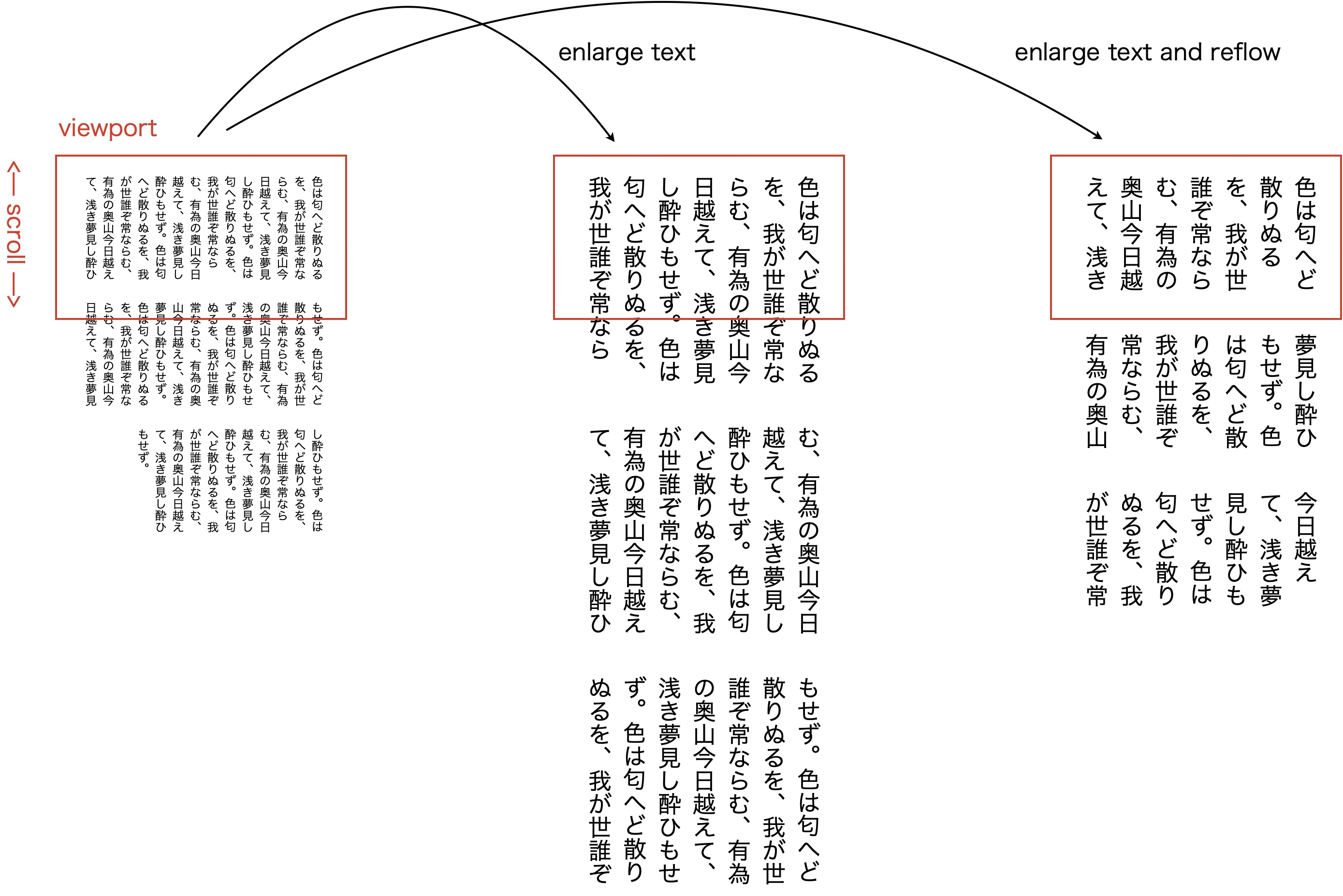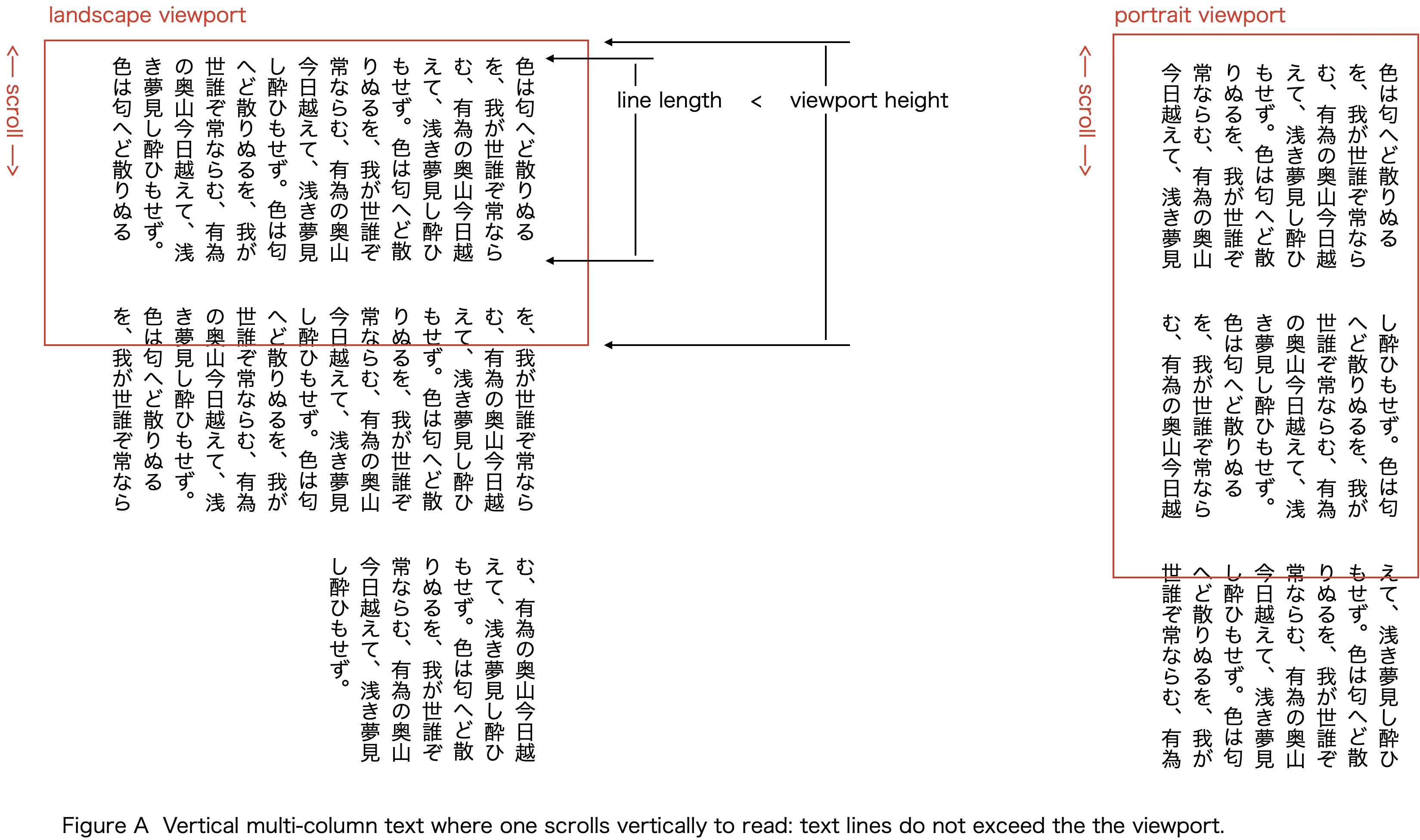 山口です。 two-dimensional scrollingというconceptに引きずられ過ぎなのかも。 添付の例でreflowしない場合は、問題ありですが、いぜんとしてone-dimensional scrollingです。 「1つの行を読むために文字が並ぶ方向にスクロールさせるのはNG」だけに基づいて説明するようにすればよいと思います。 例えば、Figure 1は 「each horizontal lineをscroll horizontally back-and-forthで読ませるのは好ましくない。 同様に、each vertical lineをscroll vertically back-and-forthで読ませるのは好ましくない。」 そこで、次にように書き直します BEFORE: Figure 1 For pages written in a language where one typically vertically scrolls the page to read (such as English), it is not desired to also need to scroll horizontally back-and-forth to read lines of text. Similarly, users reading content written in a language where one scrolls horizontally to read (such as traditional Chinese or Japanese) it is not desired to also need to vertically scroll back-and-forth to read. ↓ AFTER: Figure 1 For pages written in a language where one reads lines of text horizontally (such as English), it is not desired to need to scroll horizontally back-and-forth to read each line. Similarly, for users reading lines of text written in a language where one reads them vertically (such as traditional Chinese or Japanese), it is not desired to need to scroll vertically back-and-forth to read each line. 2025年2月28日(金) 15:02 Taku Yamaguchi <study.yamahige@gmail.com>: > > 山口です。 > > 村田さんwrote > > 縦書きのときは横スクロールがあればよく縦スクロールは不要だと解説に書かれる > > そう読まれてしまうかも。「縦組で縦スクロール」の場合が頭になくて、文章を考えてる気がします。 > > 「縦組で縦スクロールなんてあるのか?」と問われれば、「中国語にも日本語にも、縦組で縦スクロール画面はあります」 > > 關於仁海宮 - About Ren Hai Temple > https://www.renhai.org.tw/AboutUs > > 浜名湖・炭火焼うなぎ山栄 - Charcoal-grilled eel, Yamaei > https://yamaei-unagi.jp/ > > このSuccess Criterion 1.4.10: Reflowの主旨は「1つの行を読むために文字が並ぶ方向にスクロールさせるのはNG」で、 > これを「縦組で可変数段組み」に当てはめると「行の長さが画面の高さを超えないようにする」ですね。 > 実現方法としては、添付した図のように > line length < viewport height > となるようにリフローする、と。 > > > 2025年2月28日(金) 14:51 MURATA Makoto <eb2m-mrt@asahi-net.or.jp>: > > > > 縦書きのときは横スクロールがあればよく縦スクロールは不要だと解説に書かれるのは私には気持ち悪いです。いまの文面はそうなってます。 > > > > 村田 真 > > > > 2025年2月27日(木) 15:13 Atsushi Shimono (W3C Team) <atsushi@w3.org>: > >> > >> shimonoです > >> > >> On 2025/02/27 13:02, MURATA wrote: > >> > 皆さん、 > >> > > >> > 縦書きのリフローとスクロールに関連するWCAG解説書に大幅な変更があり、私のところにレビュー依頼が来ています。WCAG 2.2本体ではなく解説のほうです。 > >> > > >> > まだちゃんと見ていないのですが以下の記述が気になっています。 > >> > > >> > Similarly, users reading content written in a language where one scrolls horizontally to read (such as traditional Chinese or Japanese) it is not desired to also need to vertically scroll back-and-forth to read. > >> > > >> > なぜ気になっているかというと、山口啄さんが問題提起した縦組で可変数の段組み #77 <https://github.com/w3c/jlreq-d/discussions/77>は、縦書きのときは増減可能な段組みを使って縦書きなのに縦スクロールという可能性を指定しています。 > >> > >> 縦書きの縦スクロールの場合であっても、「縦書きのそれぞれのブロックは画面内に収ま > >> ること」という要件は変わらないんじゃないかと思います。 > >> ページがあるPDFで、縦にページが並んでいくPC表示の時に、中身が縦書きのPDFだった時 > >> でもそこまで違和感がなくなってきた、というのも、PC表示でのアプリのウィンドウよりも > >> 各ページが長い状態だったら読みにくい感覚は残ってしまうんじゃないか、というのと同じ > >> で。 > >> > >> > >> > しかし、縦書きなのに縦スクロールというのはまだWCAGの解説書に書いてもらう段階ではないようにも思います。どうしましょう? > >> ということで、縦書きの縦スクロールでも、そこまでWCAG的な要件は変わらないのかな、 > >> と思う次第です。 > >> > > > > > > -- > > Regards, > > Makoto