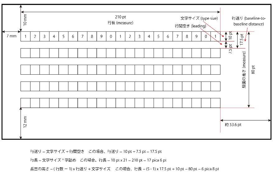 日本語の場合には、領域内(ページを含む)の版面とマージンとの関係は、版面の行長が文字サイズの整数倍というグリッドに制約されているため、単純にマージンを決めれば、行長も決まるということにはなりません。