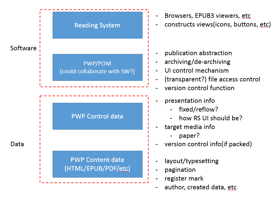> On 9 Nov 2015, at 09:42, Hiroshi Sakakibara <sakakibara.hiroshi@bpsinc.jp> wrote: > > On Sat, 7 Nov 2015 14:09:25 +0100 > Ivan Herman <ivan@w3.org> wrote: > <skip> >> >> The DPUB IG spent a certain amount of time trying to nail down a general notion of publication, more exactly a Web Publication. See >> >> http://w3c.github.io/dpub-pwp/ >> >> more exactly >> >> http://w3c.github.io/dpub-pwp/#terminology >> >> the definitions are fairly abstract, and we should add more 'meat' in the coming months, eg, to fill in details of a manifest, on URL-s, etc. But maybe it helps framing the discussion. >> >> Ivan > > Thank you for letting me know the PWP information. > I read through the PWP site. This is very informative for me. > > It would be better to clarify the publication definition with PWP > members. More specifically, this is the Digital Publishing Interest Group (DPUB IG) > Where can I find the current cooking status of the 'meat'? > (Github issues?) > The IG has a mailing list: W3C Digital Publishing IG <public-digipub-ig@w3.org> but, specifically, the PWP has indeed an issue list https://github.com/w3c/dpub-pwp/issues > > For my understanding, I illustrated an architectural figure[1]. > The items listed right-hand does not cover whole publication/PWP > information yet. > I see Daniel has already answered some questions; I do not really have anything to add to those > This figure raises some questions and thoughts: > > 1) Where dose POM position in the software architecrue? > For ease of use, it should not be implemented in browser. But POM > should interact with browser. > 2) How should "PWP Control data" be presented? > Is this data a part of Web document? > (I'm still wondering content data and control data should be > devided or not. And what "devided" means in fact..) Daniel already referred to the fact that the UI aspect is not in scope for POM. Beyond that, what you call the control data, we currently refer to as a manifest. What exactly the manifest should include I cannot tell at this moment, we did not really work on that aspect yet. However, the EPUB example (the OPF file) gives a pretty good idea of the information that we will probably have to provide for a PWP; actually, the discussion on POM will also dictated some of these. Ivan > 3) (From PWP document) I want to have UI controlling mechanism for > contents. > Current EPUB have TOC. Most of EPUB viewer has TOC button, and TOC > meta information is listed. > Travel guide books or other scientific publications require > TOC-like button to list up or to point other information. > The meta information differs depending on the contents. > So, UI controlling way from contents to RS is needed. > (In fact, I talked with JP guide book publishing company and > Japanese classics publishing company, and both of them require such > mechanism.) > > [1] http://www.tsukune.org/skk/tmp/pom/arch.png > > > PWP site has a lot of information, so I'm still in constructing my > thoughts... Sorry for kitchen sink mail. > > --- Hiroshi/skk > > >>> About haxe, don't focus too much on it. I started using it because it >>> is compilable into both JS and c++ but that's a kitchen sink, really. >>> >>> Personal note: I had health issues during the last days, hence my lack >>> of messages here. >>> >>> </Daniel> >>> >> >> >> ---- >> Ivan Herman, W3C >> Digital Publishing Lead >> Home: http://www.w3.org/People/Ivan/ >> mobile: +31-641044153 >> ORCID ID: http://orcid.org/0000-0003-0782-2704 >> >> >> >> > > -- > Sakakibara Hiroshi (skk@bpsinc.jp) > Beyond Perspective Solutions Co., Ltd. > Tel: +81-3-6279-4320 Fax: +81-3-6279-4450 > Web: http://www.bpsinc.jp/ > > ---- Ivan Herman, W3C Digital Publishing Lead Home: http://www.w3.org/People/Ivan/ mobile: +31-641044153 ORCID ID: http://orcid.org/0000-0003-0782-2704