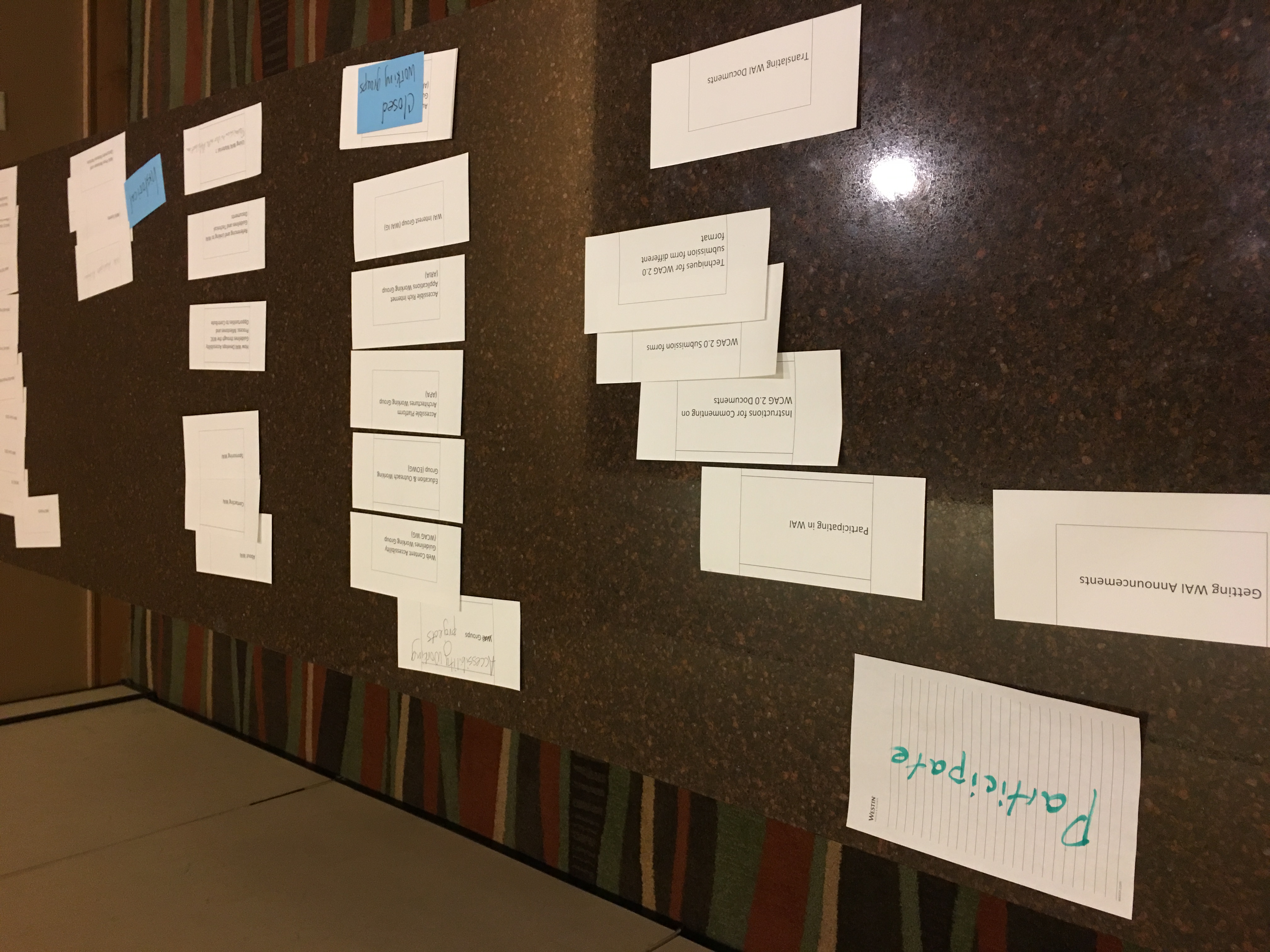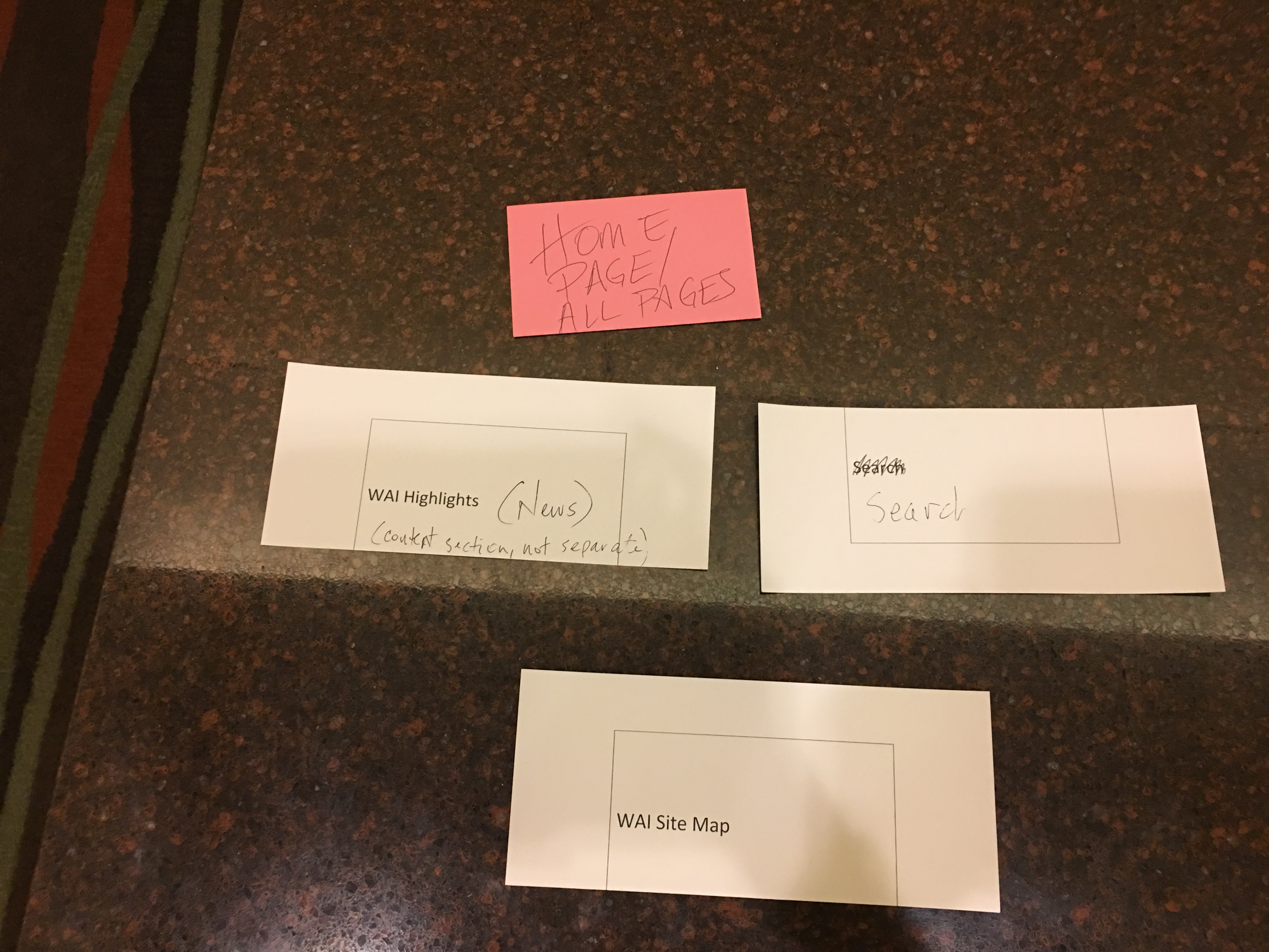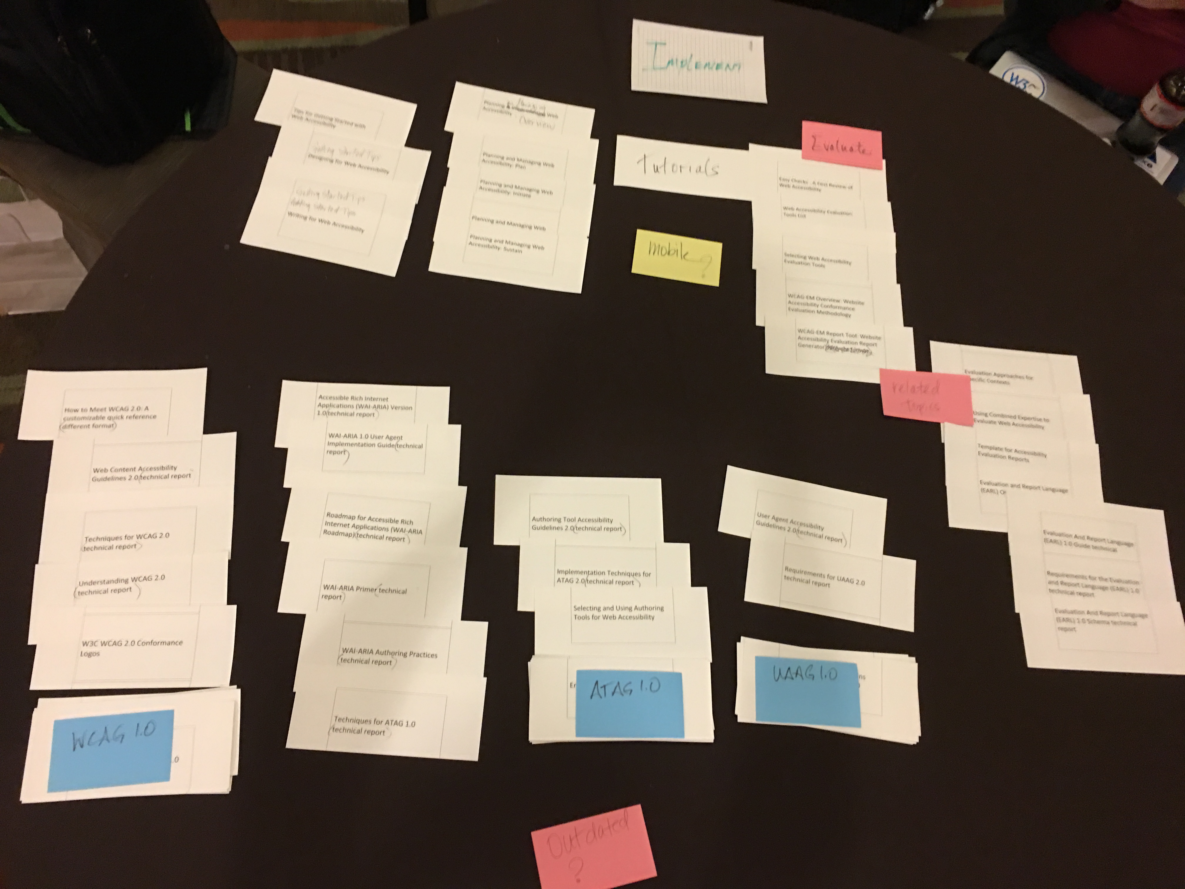 Hi all, Sorry that I wasn't clear on the links. You need to add the jpg to the end of the URI, i.e.: https://www.w3.org/WAI/EO/Drafts/UCD/2016/home-all.JPG https://www.w3.org/WAI/EO/Drafts/UCD/2016/understand1.JPG https://www.w3.org/WAI/EO/Drafts/UCD/2016/understand_wcag.JPG https://www.w3.org/WAI/EO/Drafts/UCD/2016/advocate1.JPG https://www.w3.org/WAI/EO/Drafts/UCD/2016/implement1.JPG https://www.w3.org/WAI/EO/Drafts/UCD/2016/implement2.JPG https://www.w3.org/WAI/EO/Drafts/UCD/2016/implement-idea.JPG https://www.w3.org/WAI/EO/Drafts/UCD/2016/participate1.JPG https://www.w3.org/WAI/EO/Drafts/UCD/2016/participate2.JPG https://www.w3.org/WAI/EO/Drafts/UCD/2016/participant_closed_WGs.JPG ~Shawn On 11/16/2016 8:10 AM, Shawn Henry wrote: > Hi all, > > At the face-to-face, we looked at the top tasks survey results, and James had an idea off the top of his head for categorizing them, which we promptly wrote down. :) We later re-ordered to: Understand, Advocate, Implement, Participate. We did a pass at a card sort under those 4 categories. We did *some* grouping under those categories, but *did not* do much for sub-headings or organization. We didn't have time to discuss much at all. > > NOTE these are not decided, definitive, or maybe not even recommended, just one data point to factor into the mix. > > Images of the card sort are at: > https://www.w3.org/WAI/EO/Drafts/UCD/2016/ > home-all.JPG > understand1.JPG > understand_wcag.JPG > advocate1.JPG > implement1.JPG > implement2.JPG > implement-idea.JPG > participate1.JPG > participate2.JPG > participant_closed_WGs.JPG > > You should be able to blow them up enough to read them. We will provide these in a text format as well. (Chris, did you volunteer to do that, or someone else? :) > > fyi "technical report" and "different format" is just the alt text from the images in the site map <https://www.w3.org/WAI/sitemap> that indicate links to technical reports or other page formats without WAI site navigation. > > Thanks all who contributed. It was great to work together face-to-face! We missed y'all who couldn't make it. > > Looking forward to next steps on the IA from Charlotte! > > Best, > ~Shawn