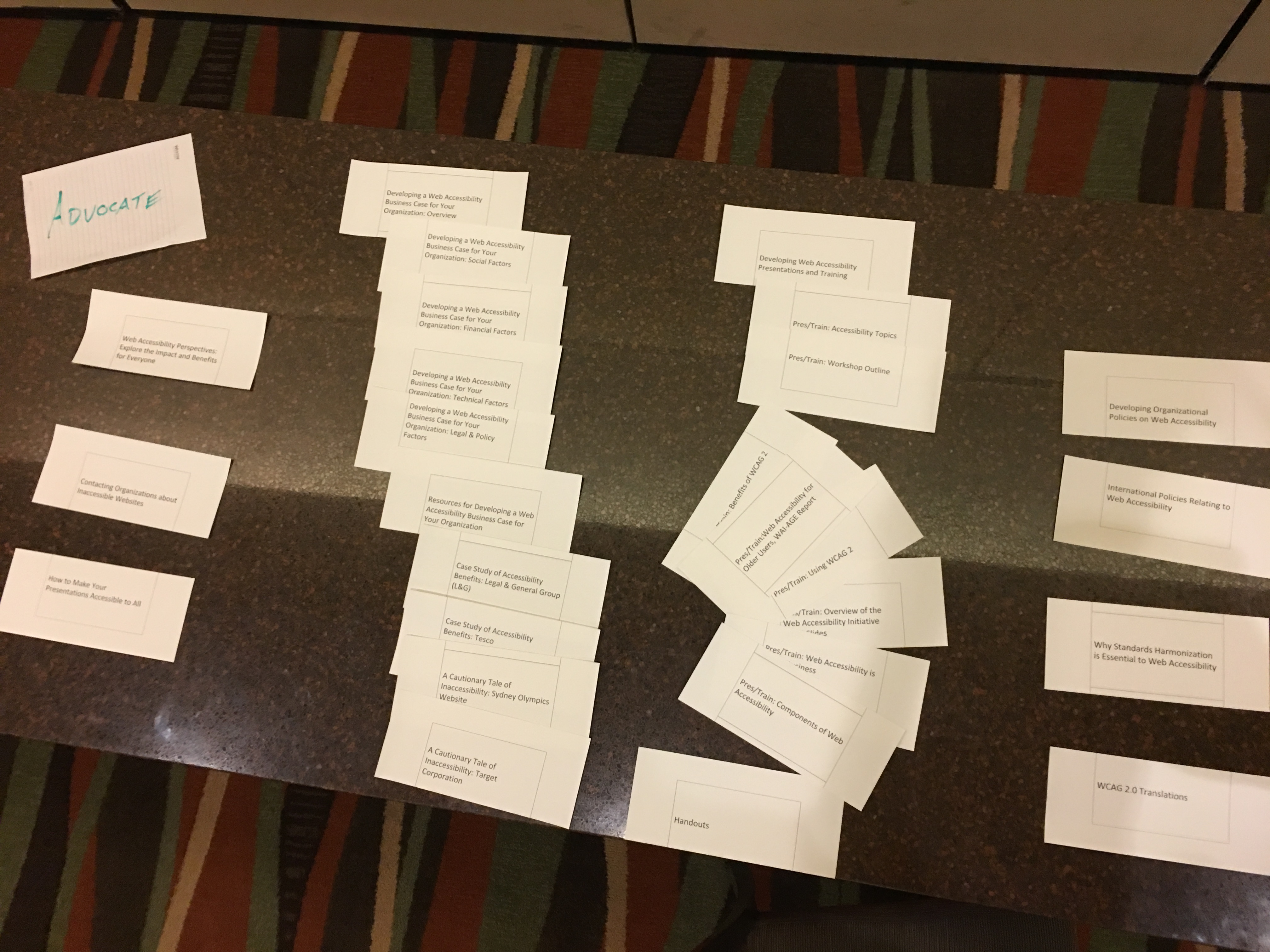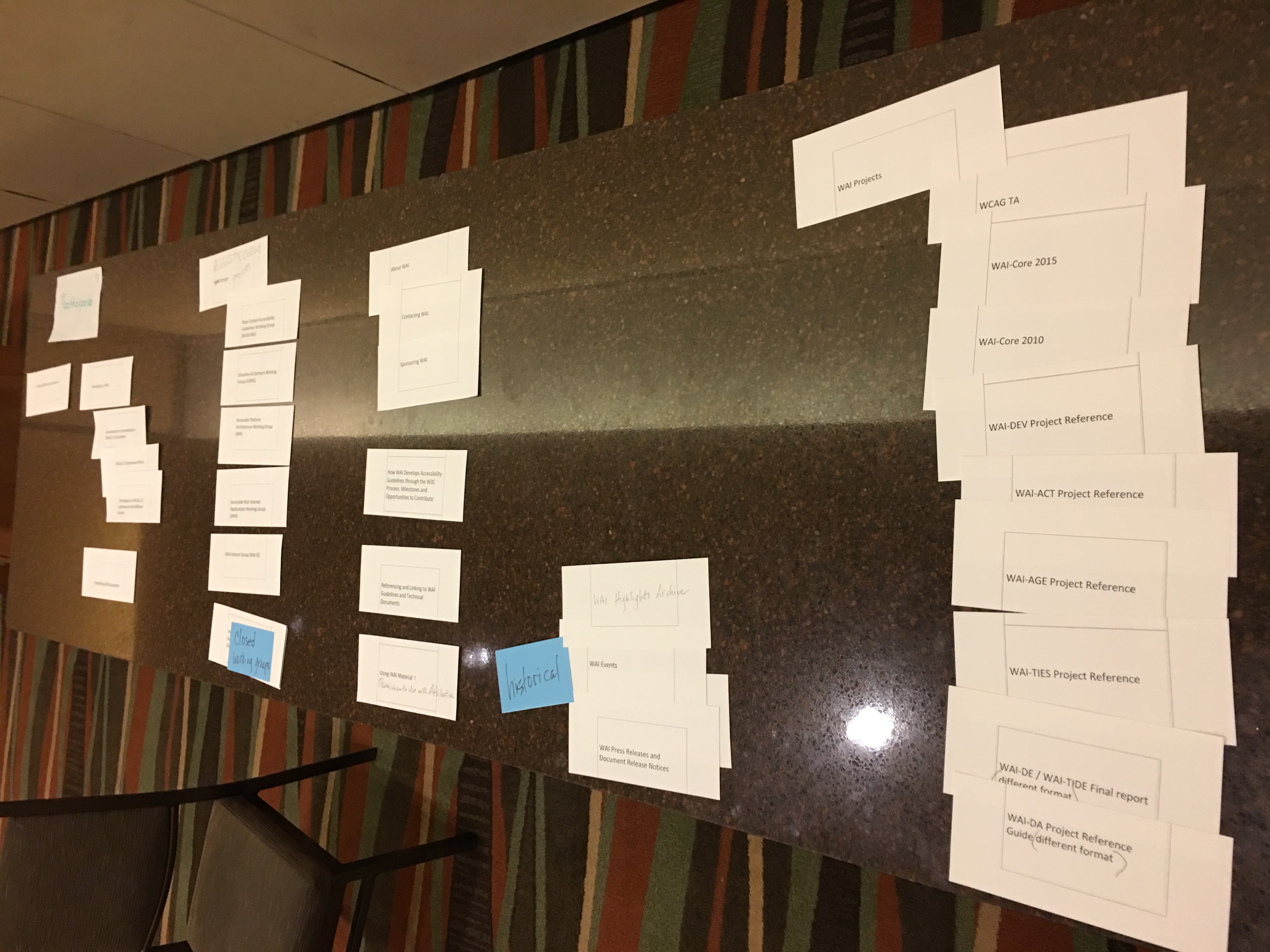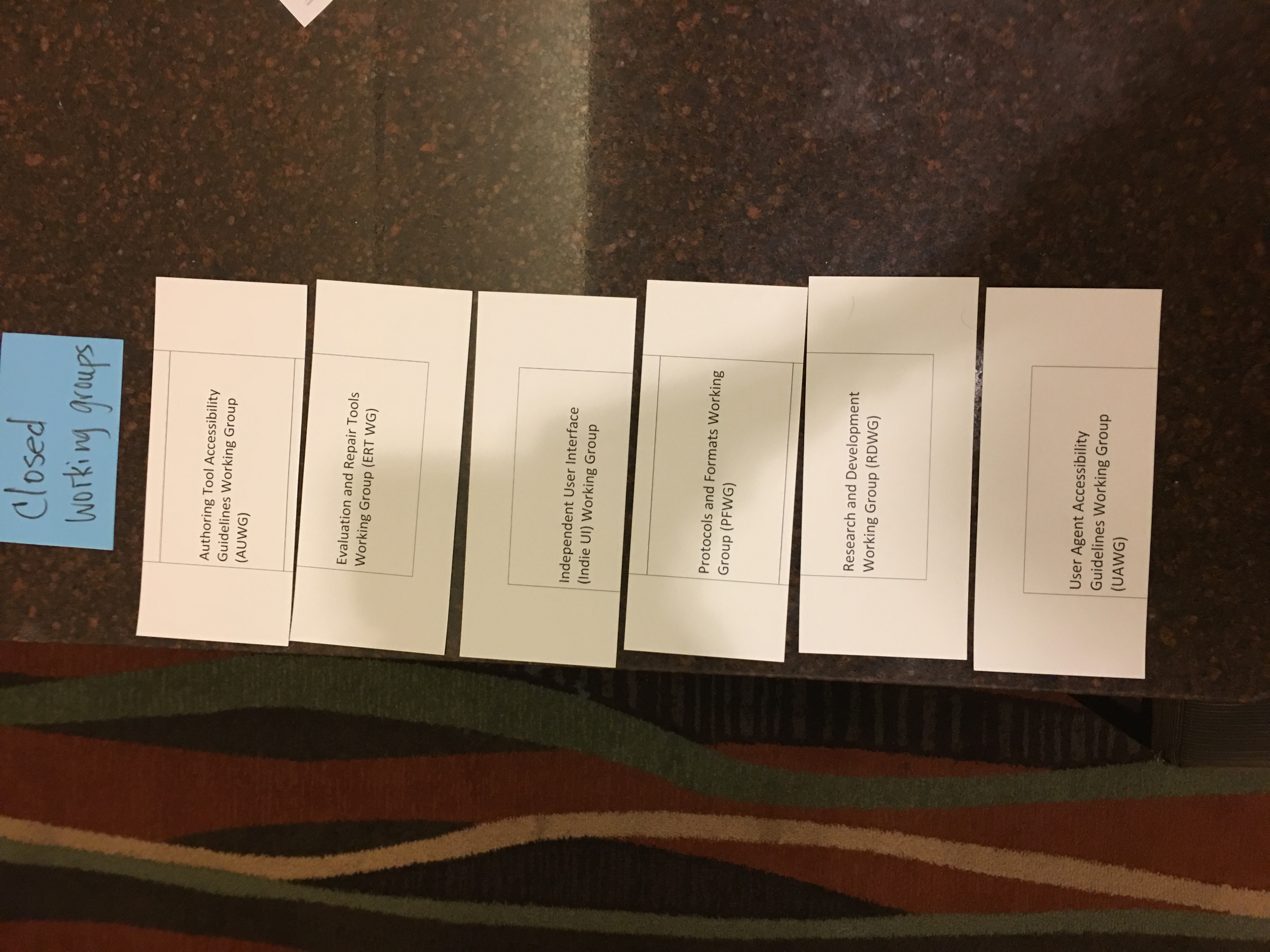 Hi all, Sorry that I wasn't clear on the links. You need to add the jpg to the end of the URI, i.e.: https://www.w3.org/WAI/EO/Drafts/UCD/2016/home-all.JPG https://www.w3.org/WAI/EO/Drafts/UCD/2016/understand1.JPG https://www.w3.org/WAI/EO/Drafts/UCD/2016/understand_wcag.JPG https://www.w3.org/WAI/EO/Drafts/UCD/2016/advocate1.JPG https://www.w3.org/WAI/EO/Drafts/UCD/2016/implement1.JPG https://www.w3.org/WAI/EO/Drafts/UCD/2016/implement2.JPG https://www.w3.org/WAI/EO/Drafts/UCD/2016/implement-idea.JPG https://www.w3.org/WAI/EO/Drafts/UCD/2016/participate1.JPG https://www.w3.org/WAI/EO/Drafts/UCD/2016/participate2.JPG https://www.w3.org/WAI/EO/Drafts/UCD/2016/participant_closed_WGs.JPG ~Shawn On 11/16/2016 8:10 AM, Shawn Henry wrote: > Hi all, > > At the face-to-face, we looked at the top tasks survey results, and James had an idea off the top of his head for categorizing them, which we promptly wrote down. :) We later re-ordered to: Understand, Advocate, Implement, Participate. We did a pass at a card sort under those 4 categories. We did *some* grouping under those categories, but *did not* do much for sub-headings or organization. We didn't have time to discuss much at all. > > NOTE these are not decided, definitive, or maybe not even recommended, just one data point to factor into the mix. > > Images of the card sort are at: > https://www.w3.org/WAI/EO/Drafts/UCD/2016/ > home-all.JPG > understand1.JPG > understand_wcag.JPG > advocate1.JPG > implement1.JPG > implement2.JPG > implement-idea.JPG > participate1.JPG > participate2.JPG > participant_closed_WGs.JPG > > You should be able to blow them up enough to read them. We will provide these in a text format as well. (Chris, did you volunteer to do that, or someone else? :) > > fyi "technical report" and "different format" is just the alt text from the images in the site map <https://www.w3.org/WAI/sitemap> that indicate links to technical reports or other page formats without WAI site navigation. > > Thanks all who contributed. It was great to work together face-to-face! We missed y'all who couldn't make it. > > Looking forward to next steps on the IA from Charlotte! > > Best, > ~Shawn
